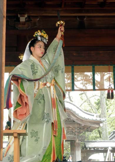 この舞には略式もありまして、装束もこのようなあこめ装束ではなく、裳も着けない裾の短い略装束の場合も多く、舞姫も一人ないし二人になる事もあります。