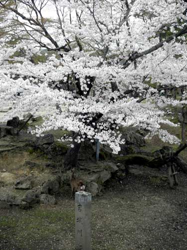 この染井吉野は東大寺の『吉城川』のもの、かなり見難いですが根元に鹿が一頭おります。