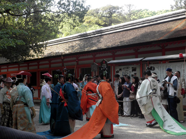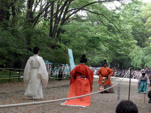 その後、馬場殿から長官代が、馬場末から一の射手が馬道脇を進み、二の的と三の的の間辺りで落ち合います。