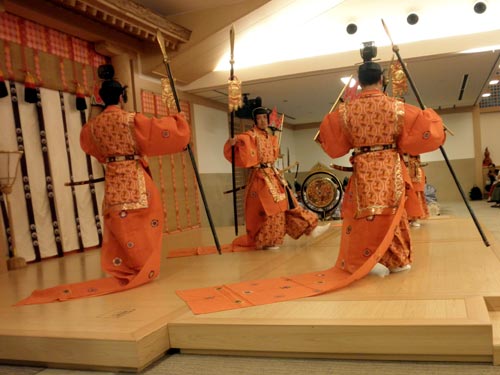 舞台を清める意味合いも込めて、左右の楽人がそれぞれ、乱声(らんじょう)に合わせて鉾を振るいます。