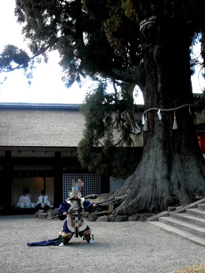 さて、これまでの写真は殆どが拝殿をバックに写しているのですが、今年は拝殿の脇の御神木の大杉と直会殿が背景になっています。