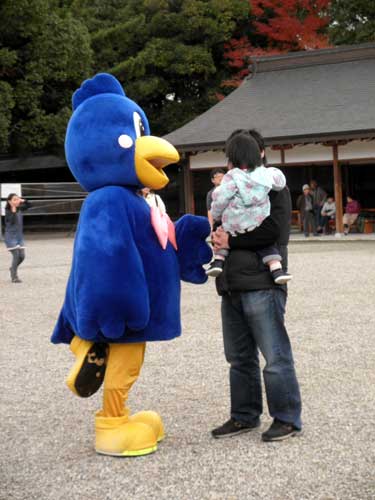 良く見ますと、尾羽の下にもう一本の脚が出ておりまして、三本脚の鴉、つまりはヤタガラスをキャラクター化している訳です(~_~;)