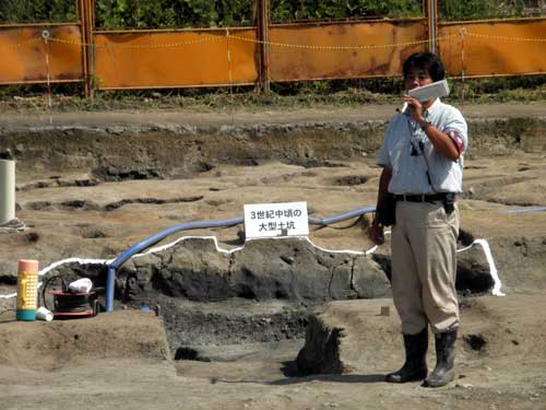 ここから出土した土器の年代は三世紀の中頃、北側で昨年までに確かめられた建物群が廃絶した時期に、ほぼ合致するのだとか。