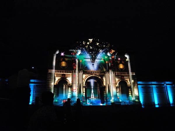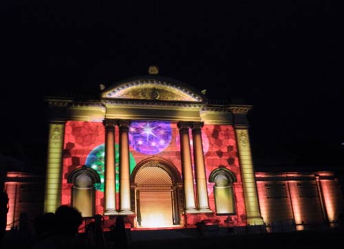 本来は中ノ島公会堂の建物をライトアップするのですが、今回は奈良国立博物館の本館に合わせて、このように光のステージを展開してくれました。