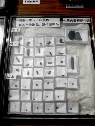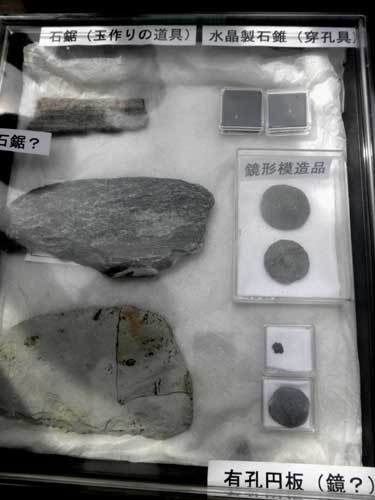 他にも鏡を模った石製模造品(こちらは別の溝から)や、石を切るのに使ったと思われる石鋸、穴を開けるのに使った水晶の石錐、磨くのに使った砥石、更には材料の石のチップも多量に出ているようです。