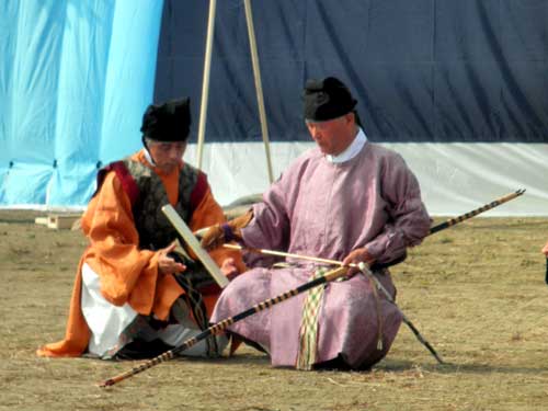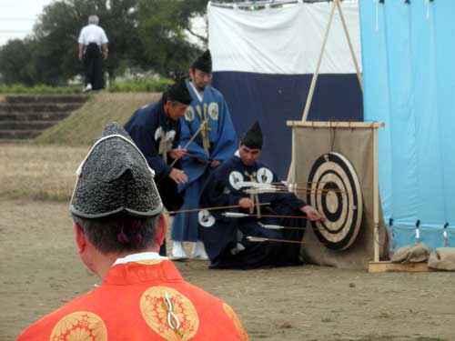 射手の方々は、いつもならば直垂を着用しているのですが、本日の装束はいつもと勝手が違うようで、弓を引くのも難しかったようです。